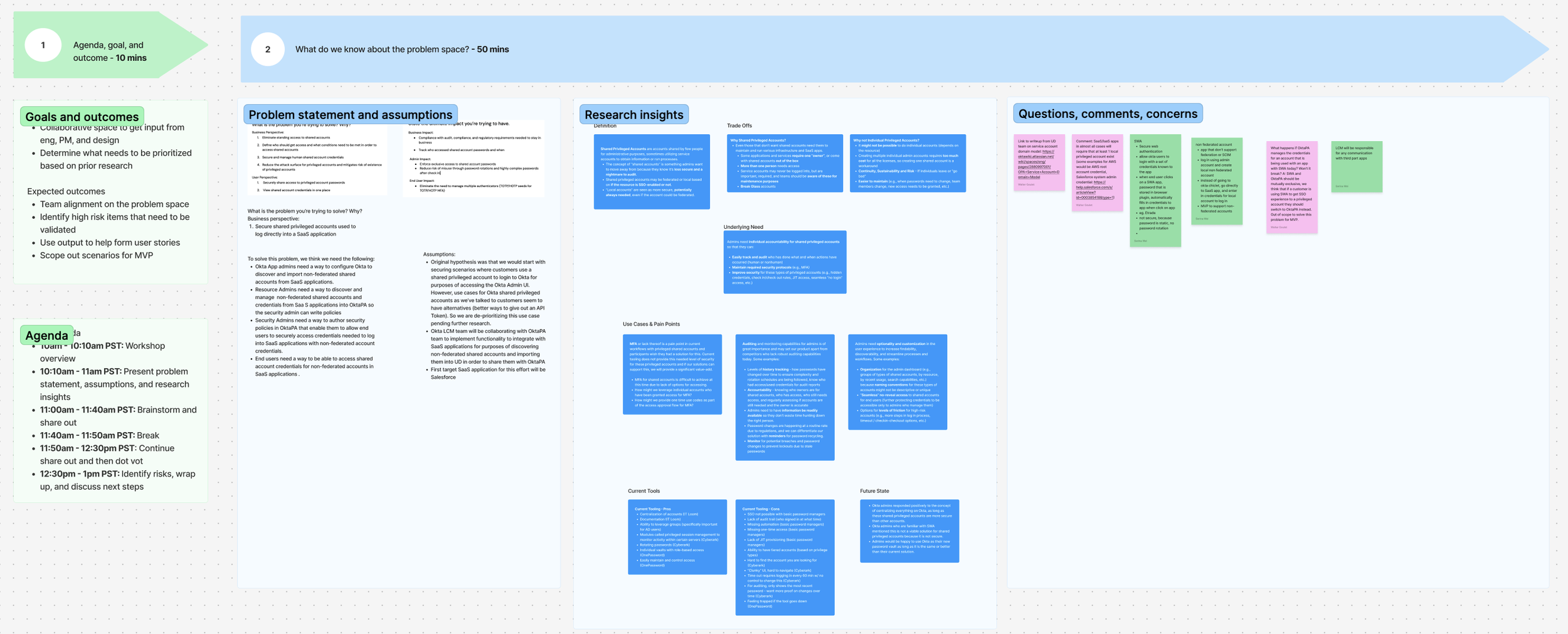 I ran a 2 day workshop with engineers, engineering manager, PMs, and our UX researcher. The workshop was broken up into different activities including knowledge sharing, problem framing, brainstorming, risks, and journey mapping.
