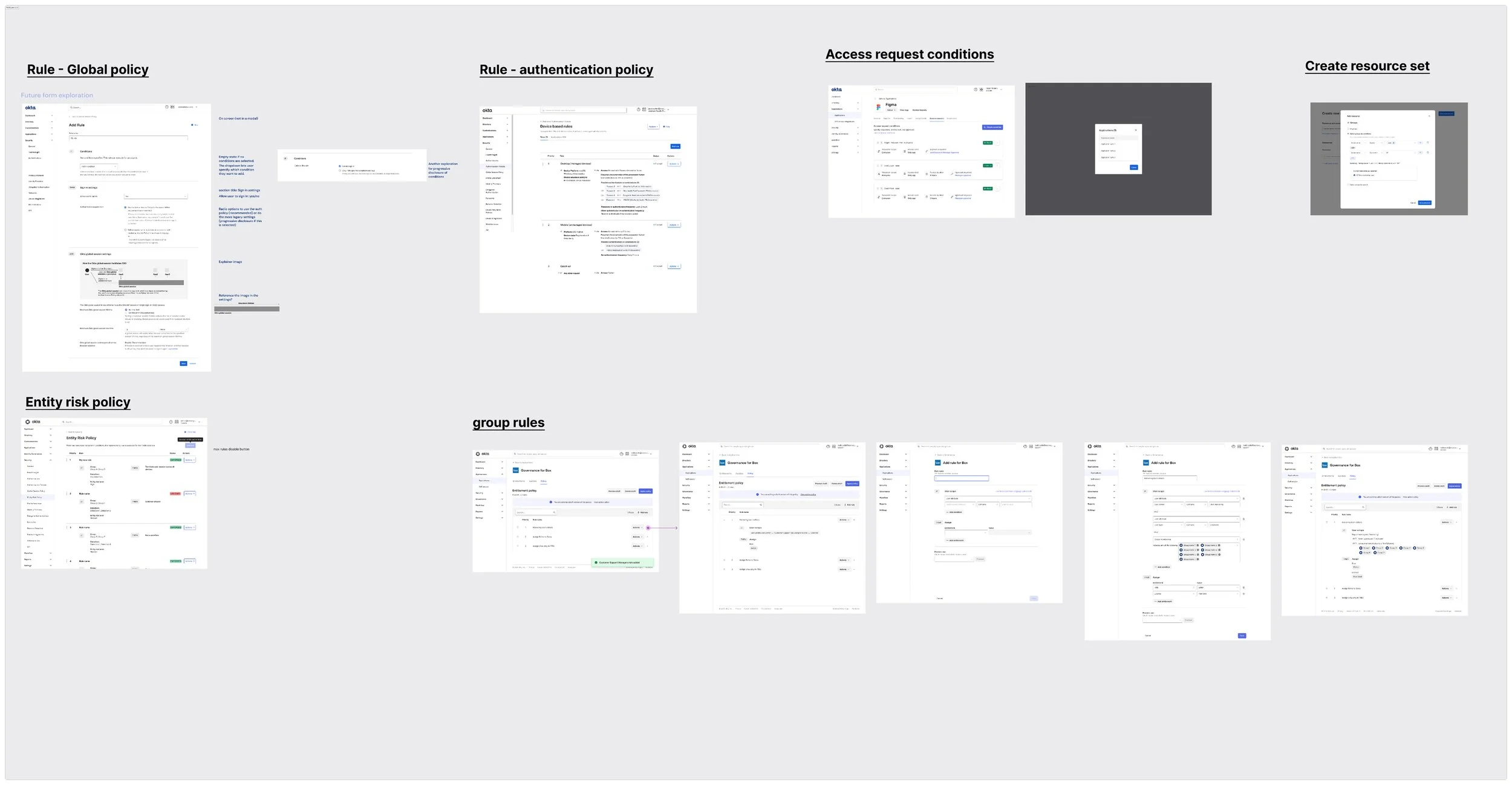 While exploring design options for policy creation, I prioritized consistency across Okta’s ecosystem to reduce cognitive load and improve usability. I conducted a comparative analysis of existing policy flows across products like Access Policies and App Sign-On Policies. Users wanted our policies to have a similar experience to existing policies within Okta.